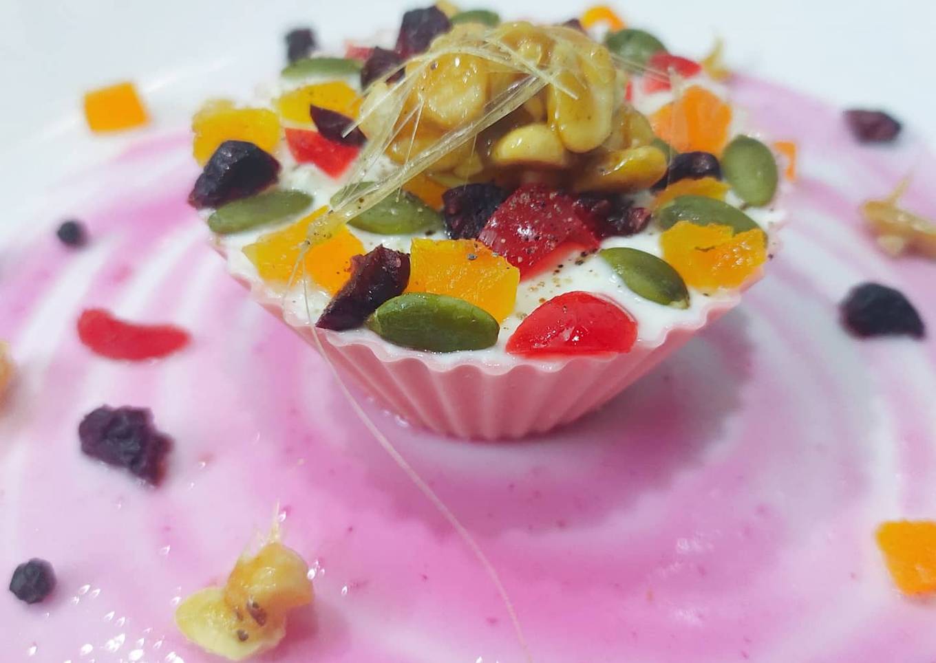 - Spread the cranberry compote in the plate. In the centre place the frozen yogurt bowl or cup. Place the peppercorn peanut crunchy ball on top with some sugar spuns.