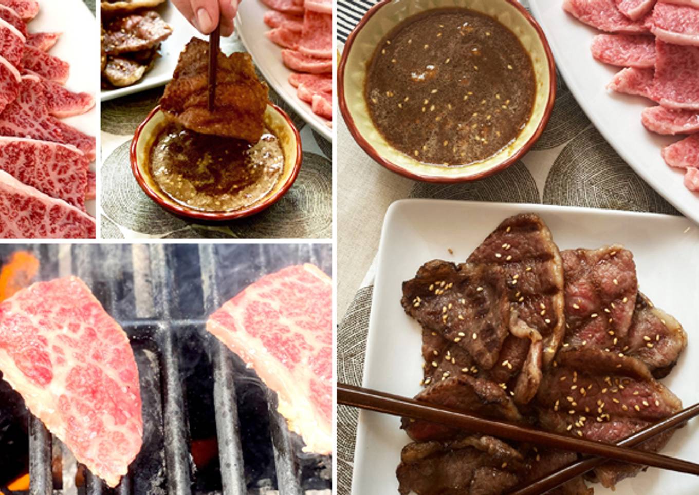 Plate the grilled Miyazakigyu Wagyu short ribs. Serve the short ribs warm with the Yakiniku sauce on the side. Using chop sticks to grab the beef, generously dip the grilled short ribs in the delicious sauce.Enjoy!