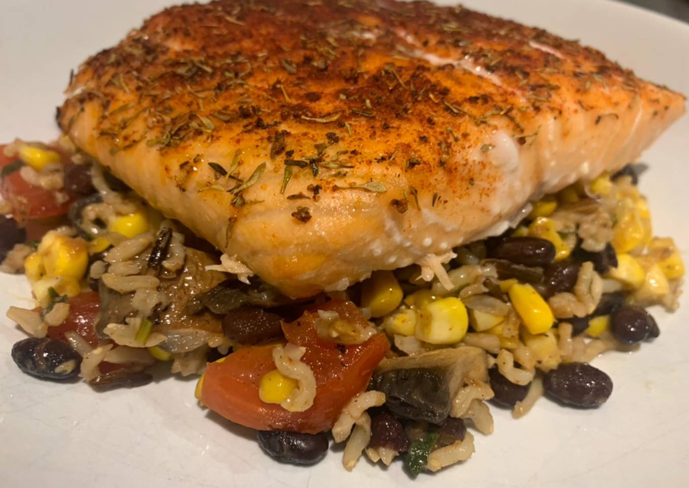 - Heat one more tbsp oil in a pan over a medium heat. At the garlic, beans, rice and tomatoes and fry for 1 minute. Then add all of the remaining ingredients and mix. I served mine with grilled salmon.